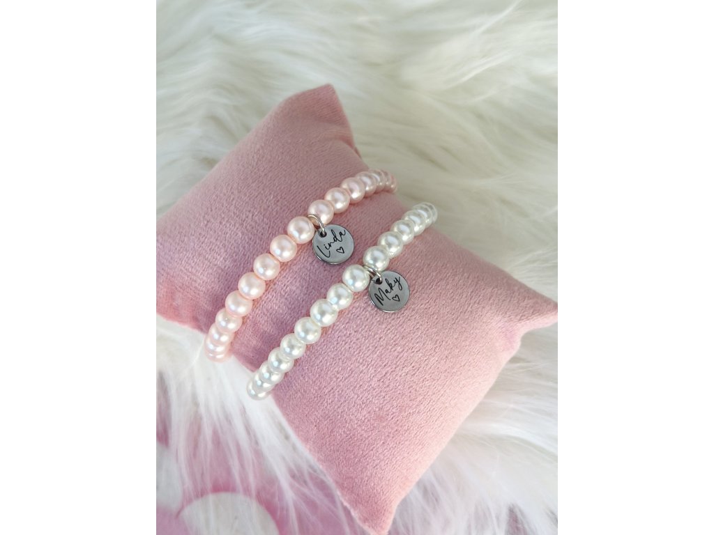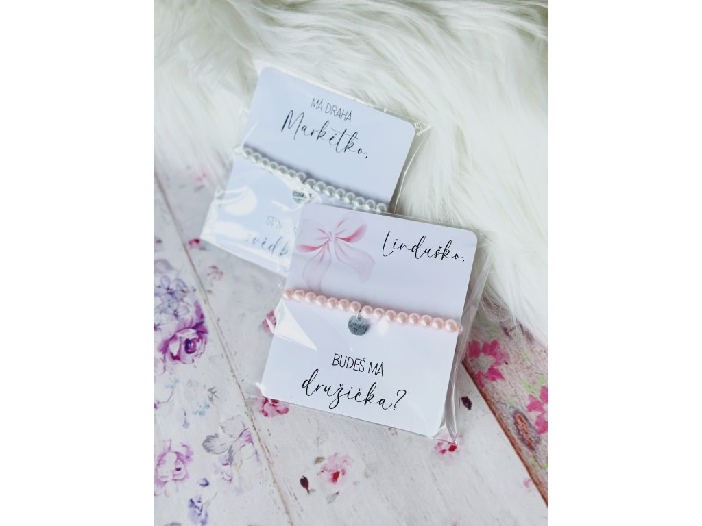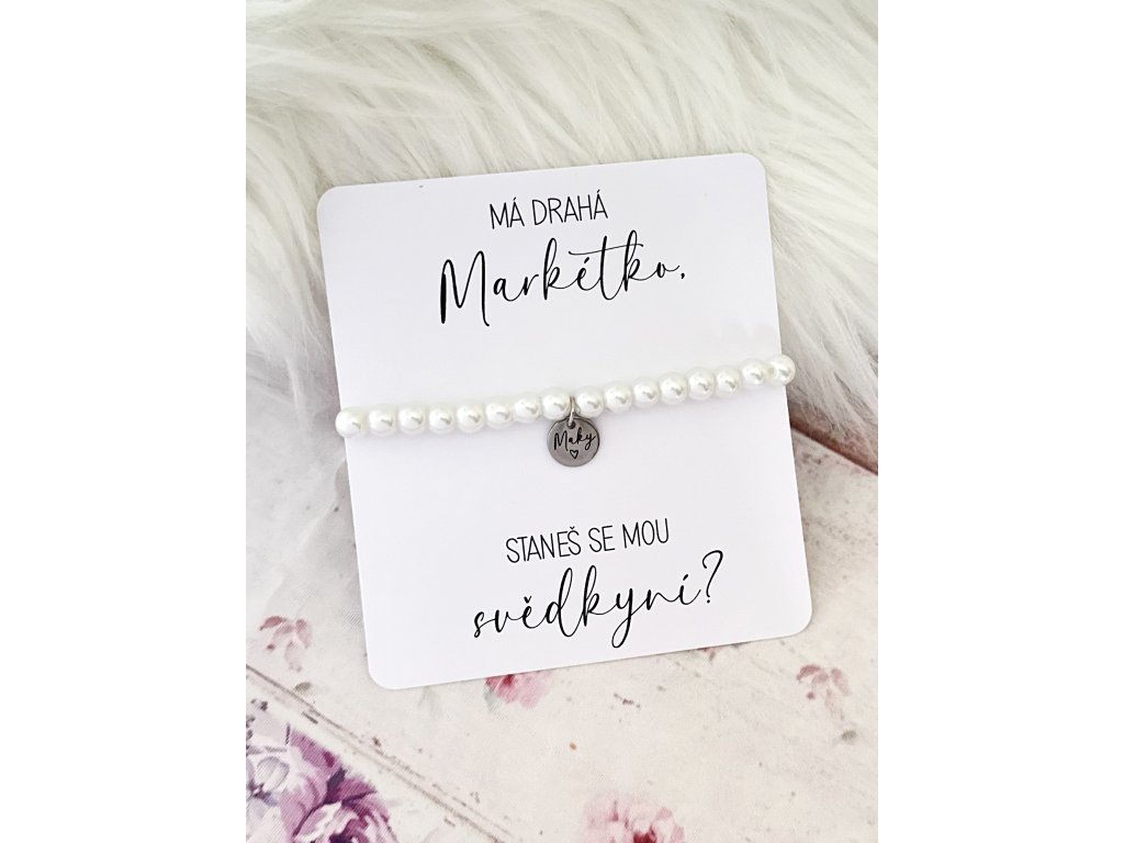 Jemný perličkový náramek s 6mm korálky a ocelovým přívěskem se jménem na přání. Dodáváme na kartičce s vlastním věnováním — ideální jako žádost či poděkování pro svědkyni nebo družičku.