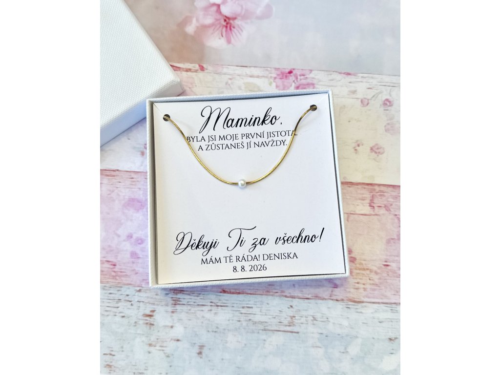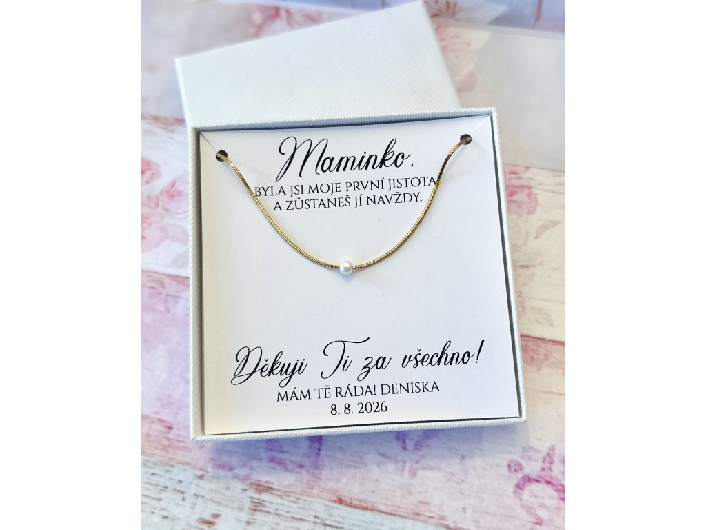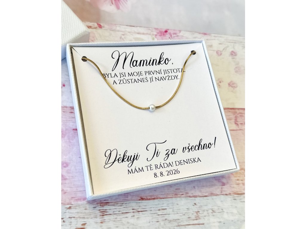 Elegantní náhrdelník ze zlaté chirurgické oceli s jemnou perličkou a dárkovou krabičkou s vlastním věnováním. Ideální dárek pro maminku, svědkyni, družičku nebo blízkou osobu.