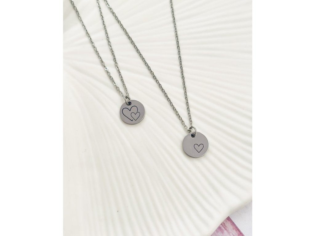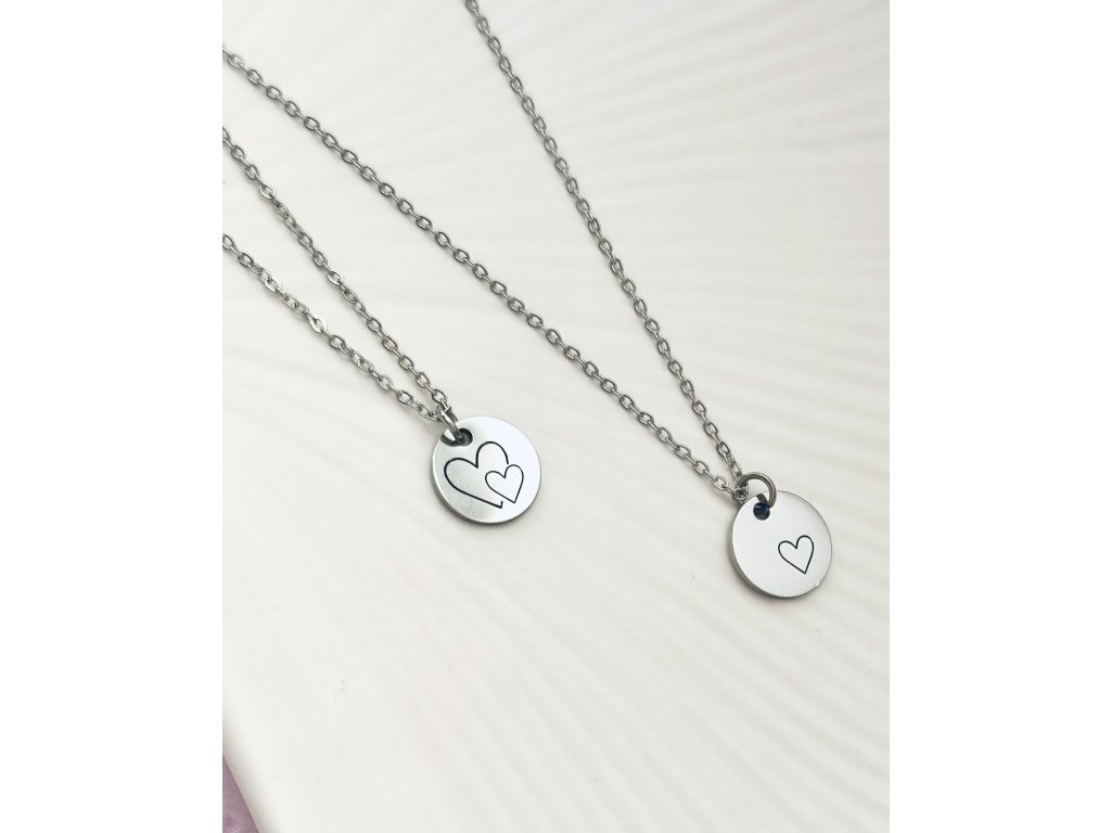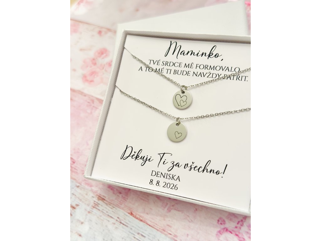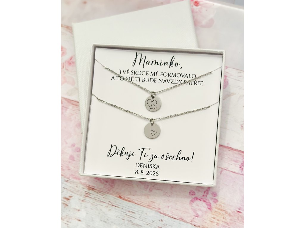 Set dvou náhrdelníků z chirurgické oceli s motivem dvou srdíček pro maminku a jednoho srdíčka pro dceru. Na zadní stranu obou přívěsků vygravírujeme datum svatby na přání, vznikne tím osobní a dojemná vzpomínka. Krásný dárek, který je plný emocí.