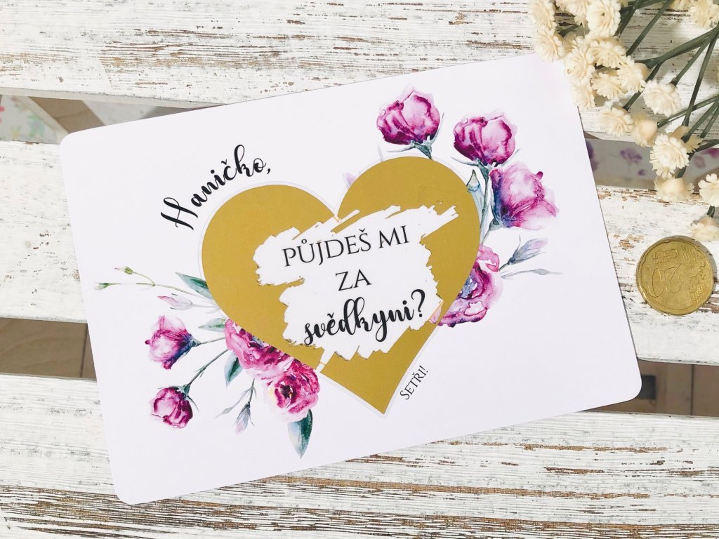 Žádost pro svědkyni či družičku formou stíracího losuMotiv květiny zvané Jícnovka - Eustoma s velkým stíracím srdcemOslovení a případnou úpravu textu napište níže do poznámky.