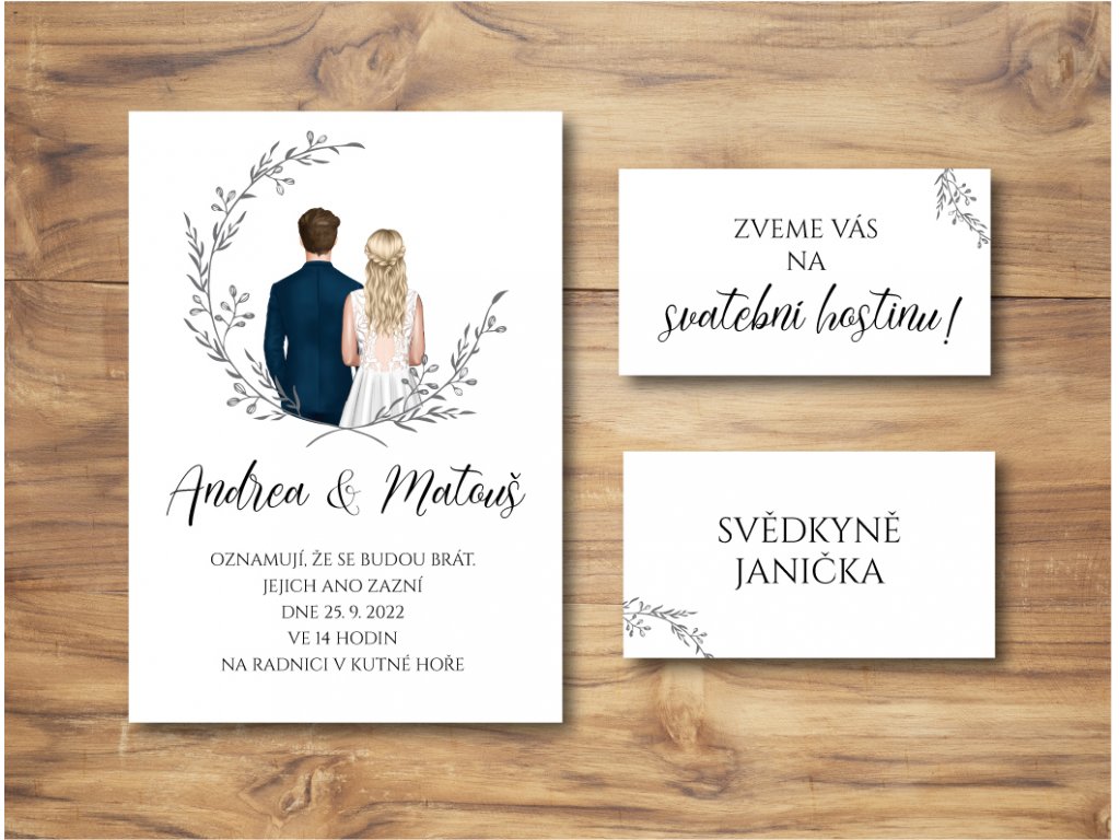Svatební oznámení A6 s účesy na výběr pro ženicha i nevěstu.